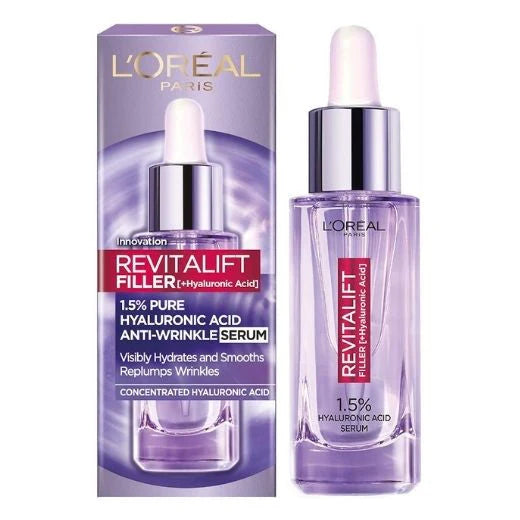 Put the bounce back in your step with the L'Oreal Revitalift Filler Hyaluronic Acid Serum. Formulated with 1.5% Hyaluronic Acid, the serum strives to restore radiance and moisture to your complexion. This product contains L’Oreal’s highest concentration of the beauty industry’s most sought after ingredient, working to deeply nourish and hydrate your skin.