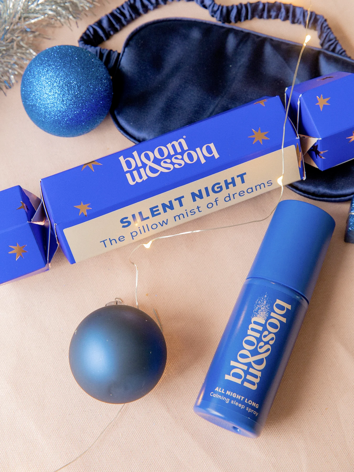Giving the ‘gift of sleep’ is THE gift that everyone on your present list will love this party season. So may we present Silent Night containing our pillow mist of dreams in this stunning blue wellness cracker with shiny rose gold stars.