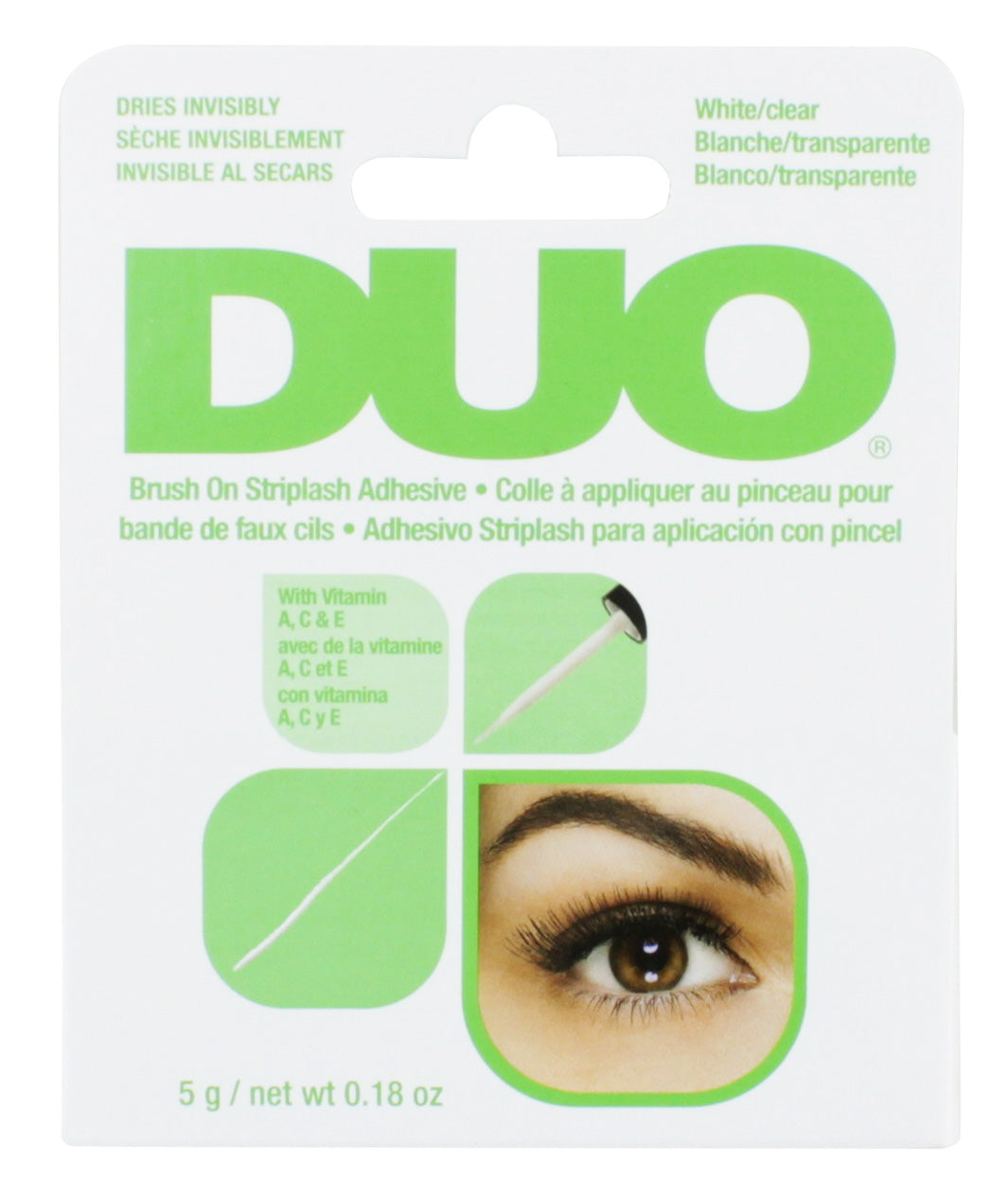 DUO Glue's Brush On lash glue comes with a brush for more precise application of the product to the lash band. This latex free formula also contains vitamins A, C and E. Perfect for both strip and individual lashes. Applies white, dries clear.